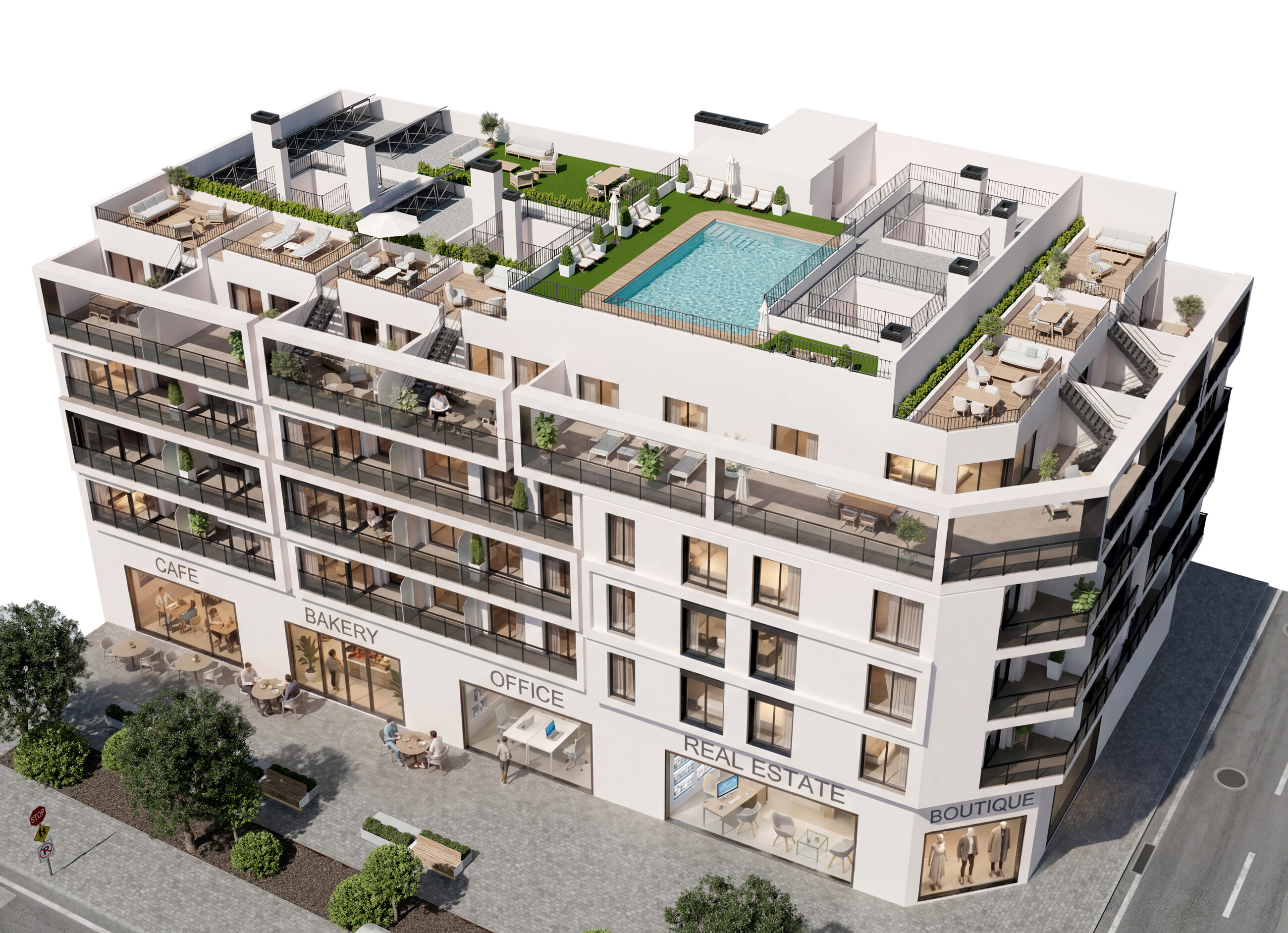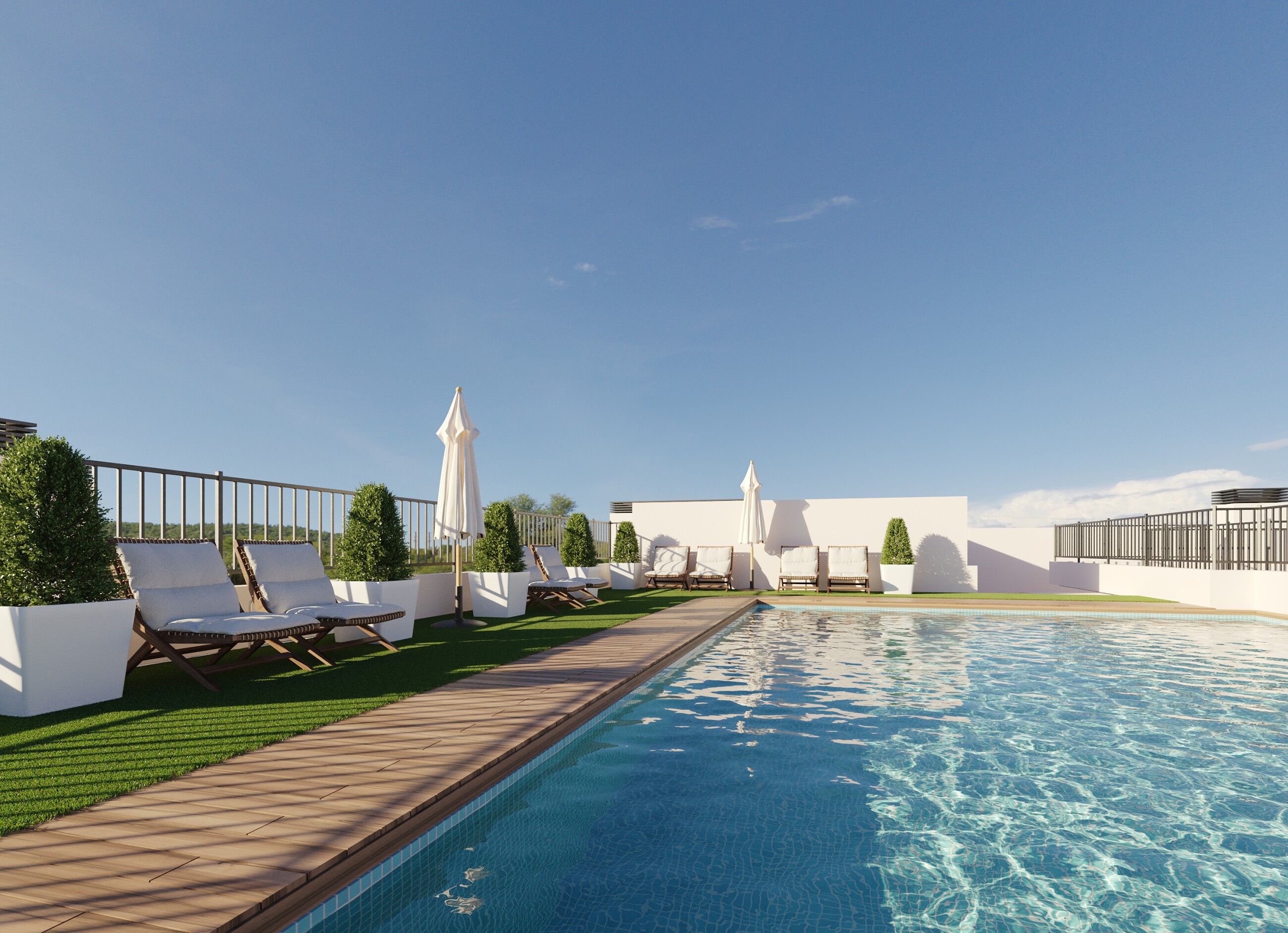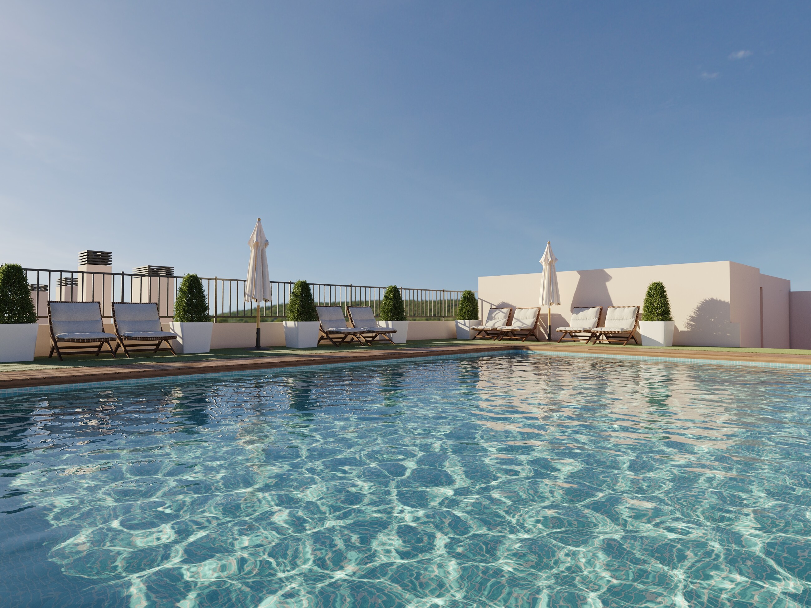 Unul dintre punctele forte ale proiectului este piscina comună situată pe acoperiș, un spațiu perfect pentru relaxare și bucuria climei mediteraneene, cu vedere spre oraș.
